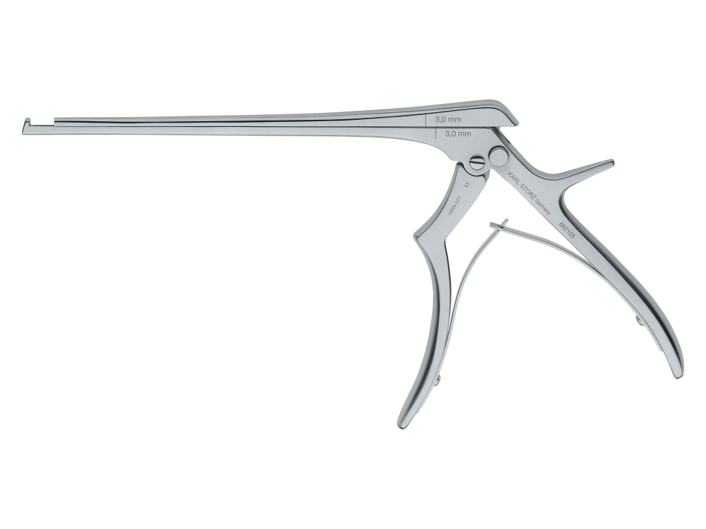 La Pinza Kerrison 90° es una herramienta especializada utilizada en procedimientos de cirugía de columna y neurocirugía para la resección precisa de tejido óseo. Su diseño permite cortar láminas óseas de manera controlada, facilitando la descompresión nerviosa en intervenciones como laminectomías y foraminotomías.